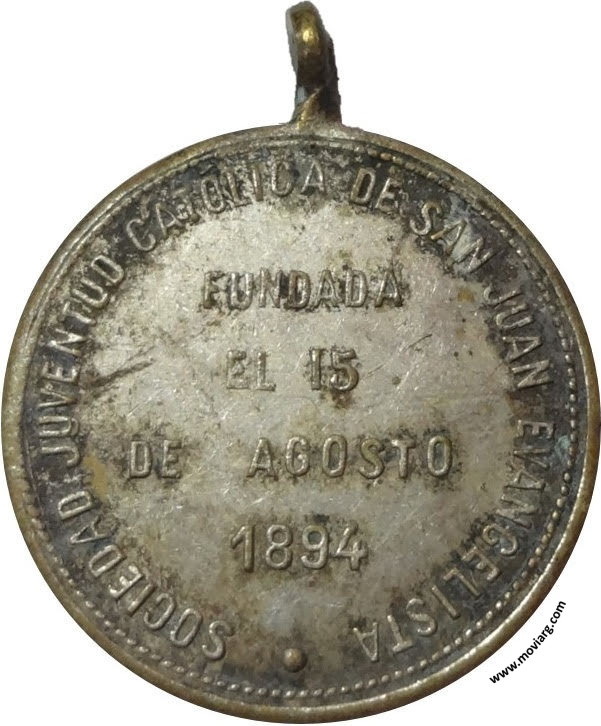 Anverso: SOCIEDAD JUVENTUD CATÓLICA DE SAN JUAN EVANGELISTA / FUNDADA / EL 15 / DE AGOSTO / 1894 Reverso: ANIVERSARIO DE SU FUNDACION / 1895. Firma: ORZALI B. Y C. Referencia: | |