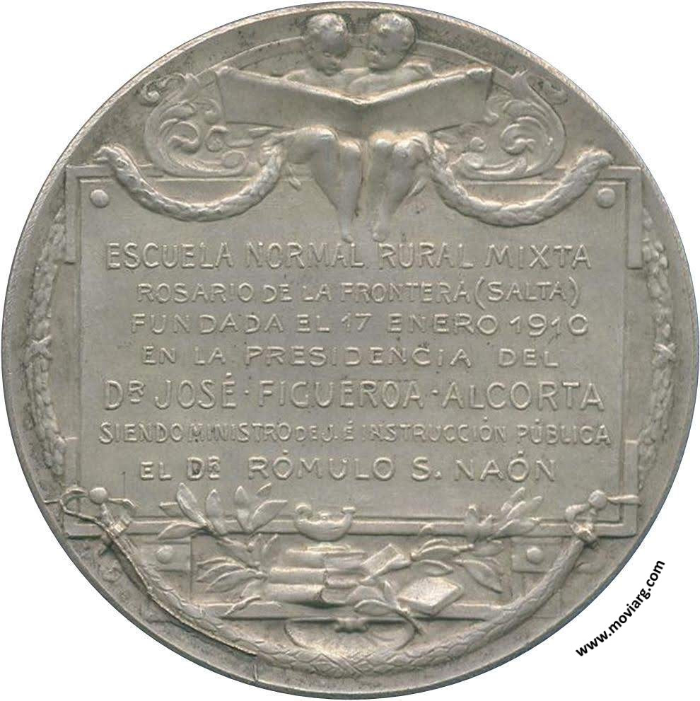 Anverso: Reverso: ESCUELA NORMAL RURAL MIXTA / ROSARIO DE LA FRONTERA ( SALTA ) / FUNDADA EL 17 ENERO 1910 / EN LA PRESIDENCIA DEL / DR. JOSÉ FIGUEROA ALCORTA / SIENDO MINISTRO DE J. É INSTRUCCIÓN PÚBLICA / EL DR. ROMULO S. NAÓN Referencia: | |