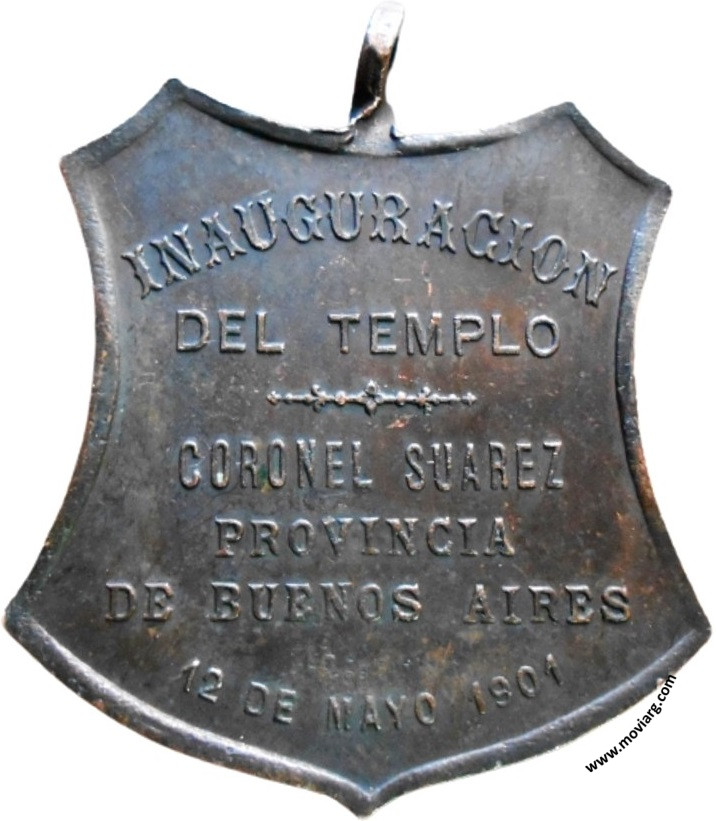Anverso: IGLESIA DE NTRA. SRA. DEL CARMEN. Firma: BELLAGAMBA Y ROSSI Reverso: INAUGURACION / DEL TEMPLO / CORONEL SUAREZ / PROVINCIA / DE BUENOS AIRES / 12 DE MAYO 1901 Referencia: | |