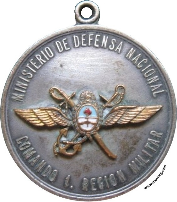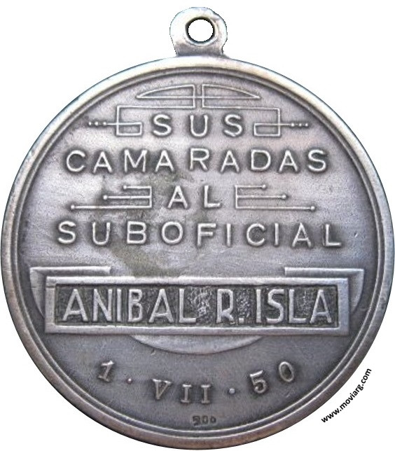 Anverso: MINISTERIO DE DEFENSA NACIONAL / COMANDO 1. REGION MILITAR Reverso: SUS / CAMARADAS / AL / SUBOFICIAL / [ ANIBAL R. ISLA ] / 1 · VII · 50. Exergo: [ 900 ] Referencia: | |