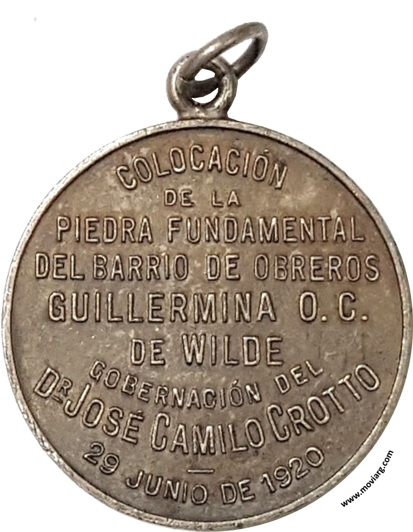 Anverso: Firma: (???) Reverso: COLOCACIÓN / DE LA / PIEDRA FUNDAMENTAL / DEL BARRIO DE OBREROS / GUILLERMINA O. C. / DE WILDE / GOBERNACIÓN DEL / DR. JOSÉ CAMILO CROTTO / 29 JUNIO DE 1920 Referencia: | |