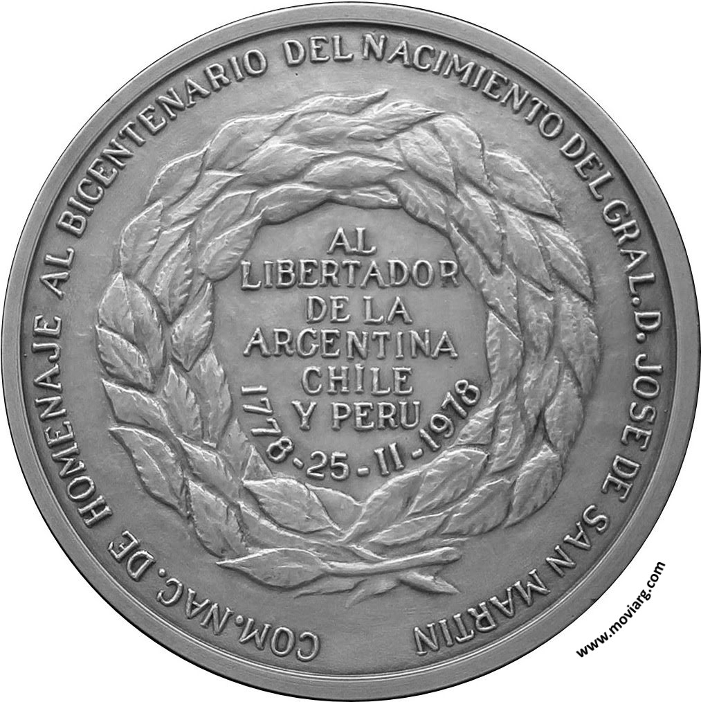 Anverso: Firma: PIANA BS.AS. Campo: JUAN CARLOS / FERRARO / A.N.A. Reverso: COM. NAC. DE HOMENAJE AL BICENTENARIO DEL NACIMIENTO DEL GRAL. D. JOSE DE SAN MARTIN / AL / LIBERTADOR / DE LA / ARGENTINA / CHILE / Y PERU / 1778 - 25 - II - 1978 Referencia: | |