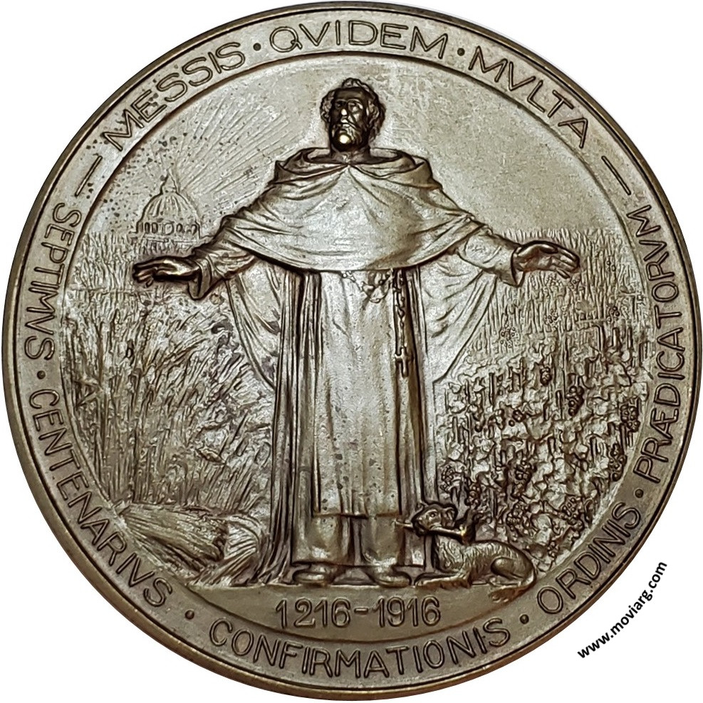 Anverso: MESSIS · QUIDEM · MULTA / SEPTIMUS · CENTENARIUS · CONFIRMATIONIS · ORDINIS · PRAEDICATORUM / 1216 - 1916 Reverso: · TUS · HIJOS · SERAN · LOS · CAMPEONES · DE · LA · FE · Y · VERDADERAS · LUMBRERAS · DEL · MUNDO - HONORIO · III · PONT · MAX ·. Firma: GOTTUZZO Y CA. Referencia: | |