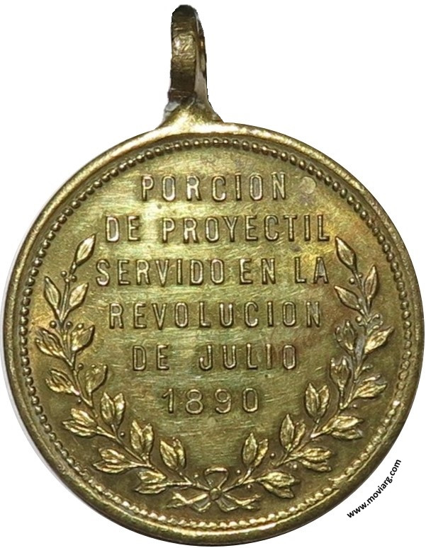 Anverso: PORCION / DE PROYECTIL / SERVIDO EN LA / REVOLUCION / DE JULIO / 1890 Reverso: BENEFICIO / DE / LOS HERIDOS / Y FAMILIAS / DE / LAS VICTIMAS / 7 SETIEMBRE Canto: Humberto Burzio: "Buenos Aires en la medalla" 1981 p32. Referencia: BURZIO-50 | |