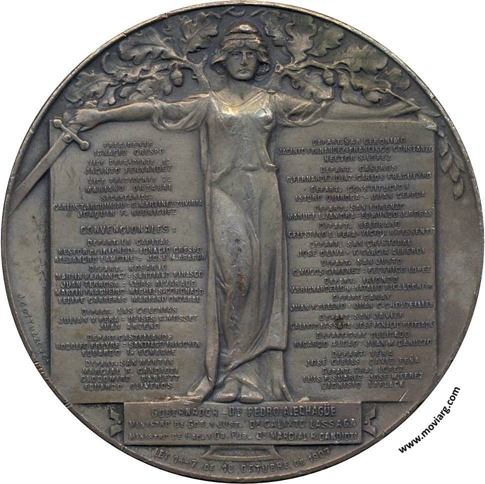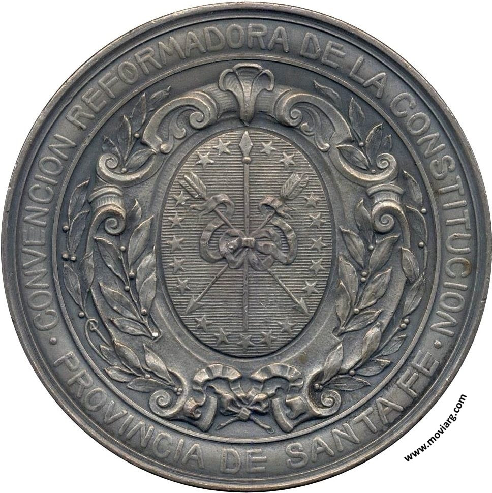 Anverso: CONVENCION REFORMADORA DE LA CONSTITUCION / PROVINCIA DE SANTA FE Reverso: PRESIDENTE / IGNACIO CRESPO / VICE PRESIDENTE 1° / JACINTO FERNANDEZ / VICE PRESIDENTE 2° / MARIANO ORZABAL / SECRETATIOS: / CARLOS T. ARGUIMBAU = G. MARTINEZ ZUVIRIA / JOAQUIN F. RODRIGUEZ / CONVENCIONALES : / DEPART. LA CAPITAL / NESTOR DE IRIONDO = IGNACIO CRESPO / ALEJANDRO LAMOTHE = JOSE M. ARAGON / DEPART. ROSARIO / MARTIN HERNANDEZ = SANTIAGO PINASCO / JUAN TERROSA = ELIAS ALVARADO / MARTIN FRAGUEIRO = MIGUEL S. CORONADO / FELIPE CARRERAS = MARIANO ORZABAL / DEPART. LAS COLONIAS / JULIAN V. PERA = ULISES R. MOSSET / JUAN ARZENO / DEPART. CASTELLANOS / RODOLFO FREYRE = SANTIAGO IRIGOYEN / EDUARDO L. ECHAGÜE / DEPART. SAN MARTIN / MARCIAL R. CANDIOTI / CLODOMIRO BARLETT / EDUARDO OLIVEROS / DEPART. SAN GERONIMO / JACINTO FERNANDEZ = FRANCISCO CONSTANZO / HECTOR S. LOPEZ / DEPART. CASEROS / G. FERNANDEZ DIAZ = CARLOS FRAGUEYRO / DEPART. CONSTITUCION / ISIDORO QUIROGA = JUAN CEPEDA / DEPART. SAN LORENZO / MANUEL L. ZAMORA = EDMUNDO J. ROSAS / DEPART. BELGRANO / CELESTINO L. PERA = VICTOR R. PRESSENTI / DEPART. SAN CRISTOBAL / JOSÉ OLIVA = F. GARCIA ALBERDI / DEPART. SAN JUSTO / C. VODOS GIMENES = FEDERICO LOPEZ / DEPART. IRIONDO / V. BRIGNARDELLO (H) = NATALIO RICALDONE / DEPART. GARAY / JUAN P. BELENO = JUAN C. CROUZEILLES / DEPART. SAN JAVIER / CALIXTO LASSAGA = JOSÉ IGNACIO PEITEADO / DEPART. GRAL. OBLIGADO / RICARDO ALDAO = JUAN M. DANUZZO / DEPART. VERA / JOSÉ CIBIUS = DAVID PEÑA / DEPART. GRAL LOPEZ / LUIS F. SUAREZ = JOSÉ M. PEREZ / DIONISIO LAPLACE / GOBERNADOR - DR. PEDRO ECHAGÜE / MINISTRO DE GOB. Y JUST. DR. CALIXTO LASSAGA / MINISTRO DE HAC. Y OB. PUB. DR. MARCIAL H. CANDIOTA / LEY 1447 DE 18 OCTUBRE DE 1907. Firma: J. GOTTUZZO Y CA. Referencia: | |