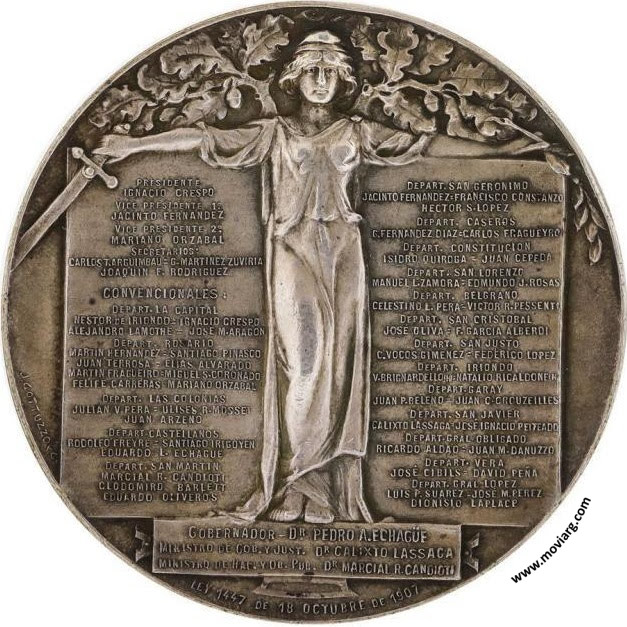 | Año: 1907 Juras de Constituciones Metal: Plata - Peso: 113gr - Módulo: 66mm Grabador: Juan Gottuzzo y Ca. | |