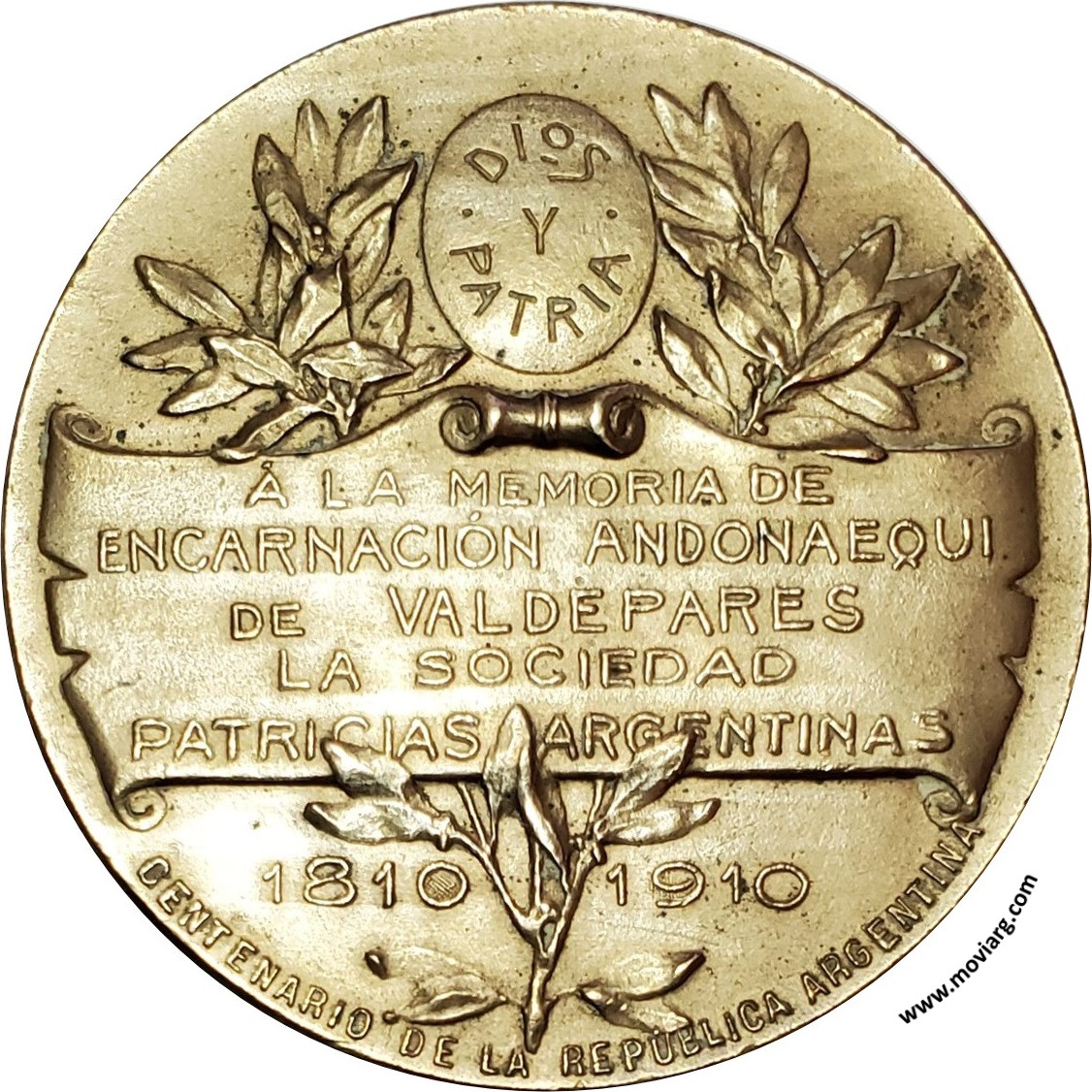 Anverso: NACIÓ / 1769 Reverso: DIOS / Y / PATRIA / Á LA MEMORIA DE / ENCARNACIÓN ANDONAEGUI / DE VALDEPARES / LA SOCIEDAD / PATRICIAS ARGENTINAS / 1810 1910 / CENTENARIO DE LA REPÚBLICA ARGENTINA Referencia: | |
