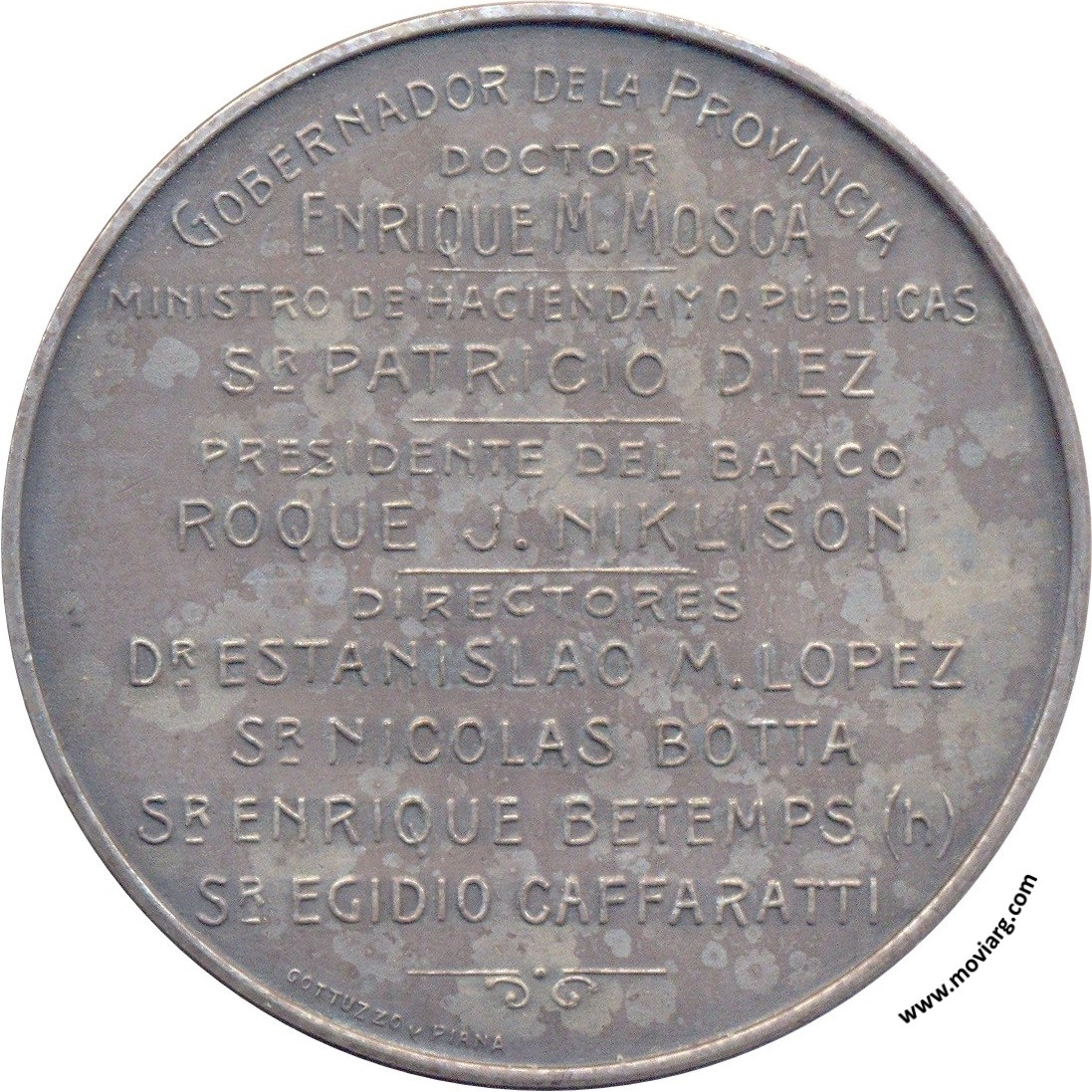 Anverso: BANCO PROVINCIAL DE SANTA FÉ / PIEDRA FUNDAMENTAL / SANTA FÉ / 1923 Reverso: GOBERNADOR DE LA PROVINCIA / DOCTOR / ENRIQUE M. MOSCA / MINISTRO DE HACIENDA Y O. PÚBLICAS / SR. PATRICIO DIEZ / PRESIDENTE DEL BANCO / ROQUE J. NIKLISON / DIRECTORES / DR. ESTANISLAO M. LOPEZ / SR. NICOLAS BOTTA / SR. ENRIQUE BETEMPS (H) / SR. EDIGIO CAFFARATTI. Firma: GOTTUZZO Y PIANA Referencia: | |
