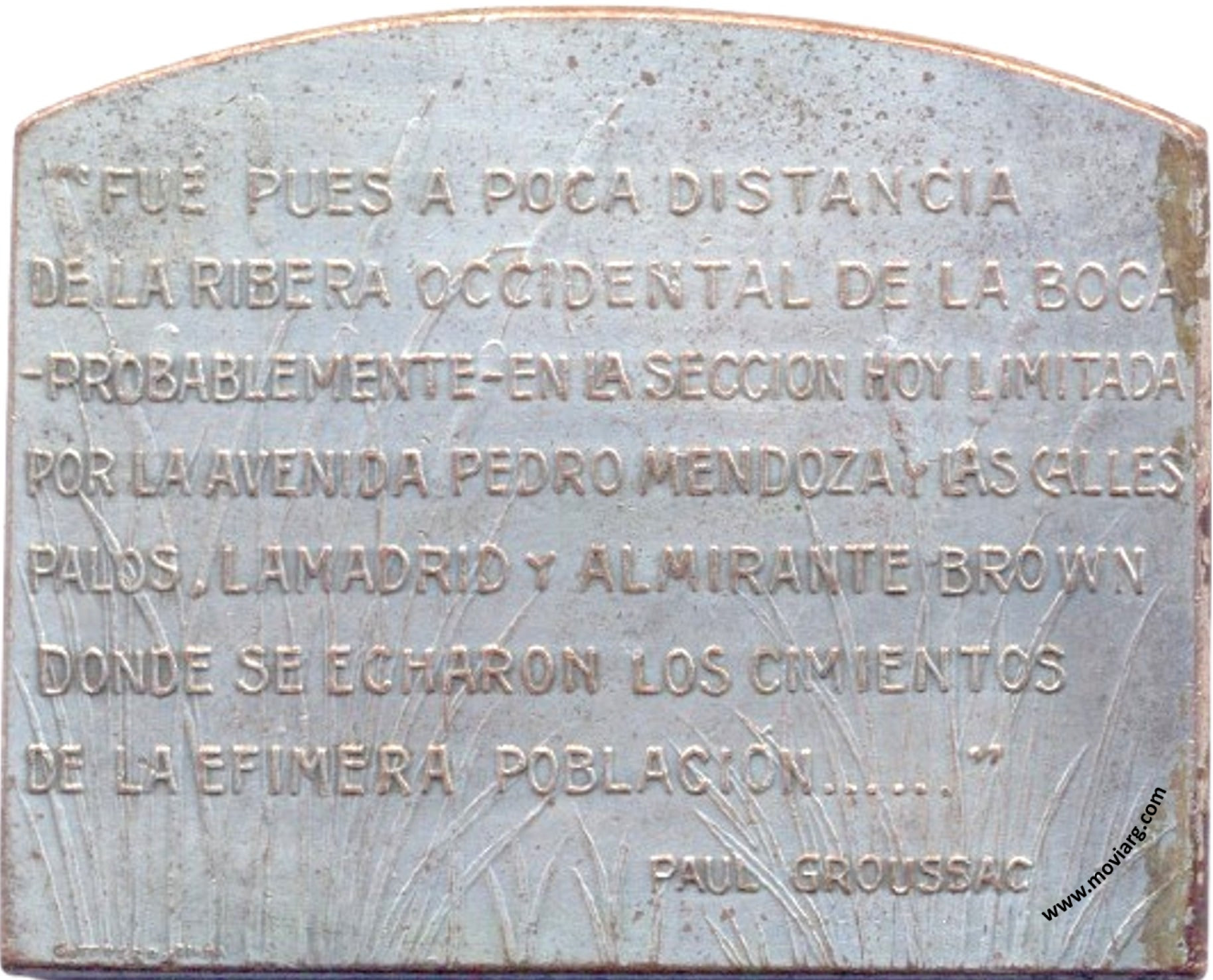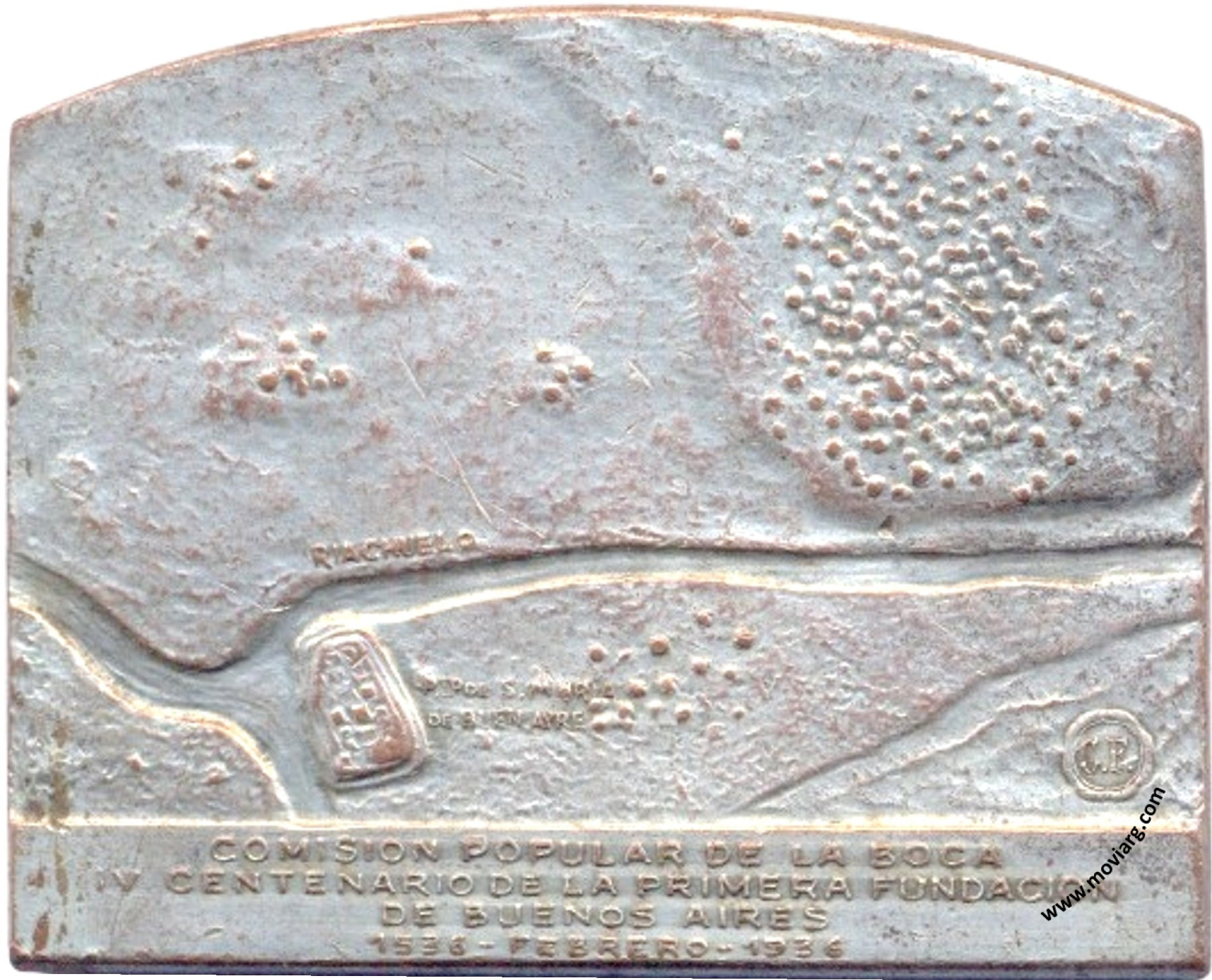 Anverso: COMISION POPULAR DE LA BOCA / IV CENTENARIO DE LA PRIMERA FUNDACION / DE BUENOS AIRES / 1536 - FEBRERO - 1936. Campo: RIACHUELO / (???) S. MARIA / DEL BUEN AYRE Reverso: " FUÉ PUES A POCA DISTANCIA / DE LA RIBERA OCCIDENTAL DE LA BOCA / - PROBABLEMENTE - EN LA SECCION HOY LIMITADA / POR LA AVENIDA PEDRO MENDOZA Y LAS CALLES / PALOS, LAMADRID Y ALMIRANTE BROWN / DONDE SE ECHARON LOS CIMIENTOS / DE LA EFIMERA POBLACIÓN ...... " / PAUL GROUSSAC. Firma: GOTTUZZO Y PIANA Referencia: | |