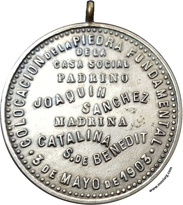 Anverso: CENTRO VILLA CRESPO / S. MUTUOS Reverso: COLOCACION DE LA PIEDRA FUNDAMENTAL / DE LA / CASA SOCIAL / PADRINO / JOAQUIN / SANCHEZ / MADRINA / CATALINA / S. DE BENEDIT / 3 DE MAYO DE 1903 Referencia: | |