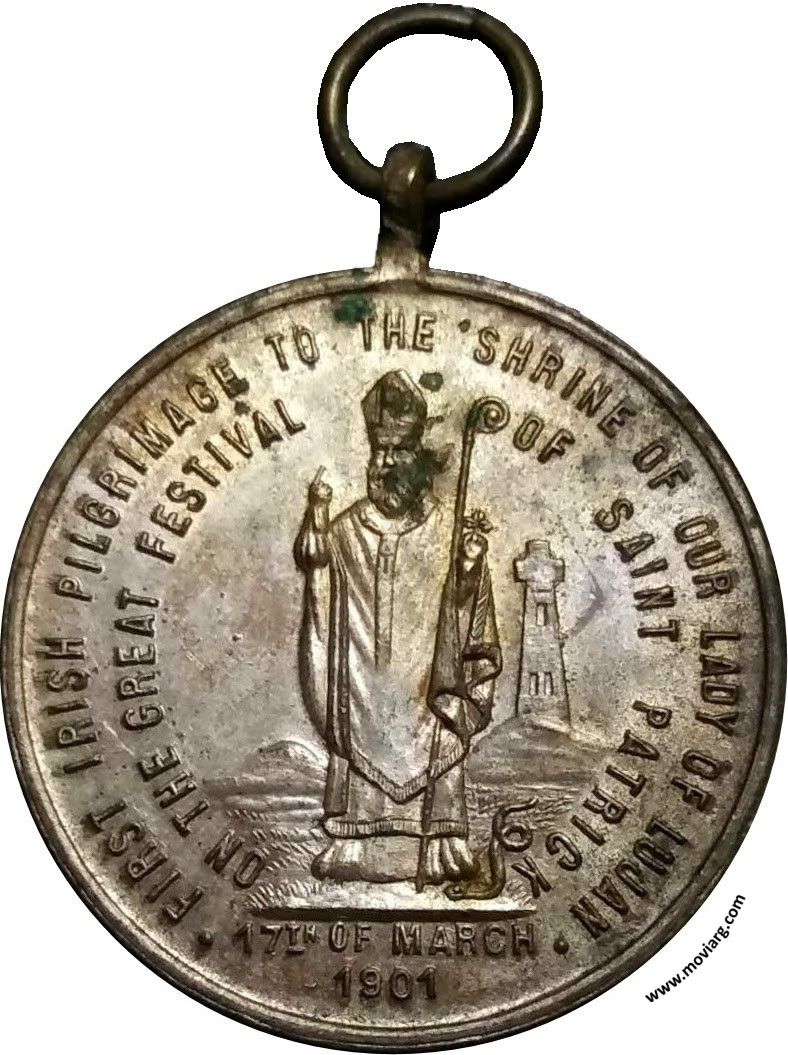 Anverso: FIRST IRISH PILGRAMAGE TO THE SHRINE OF OUR LADY OF LUJAN / ON THE GREAT FESTIVAL / OF SAINT PATRICK / 17TH OF MARCH / 1901 Reverso: THE HOLY VIRGEN OF LUJAN / BLESSES THE IRISH COMMUNITY Referencia: | |