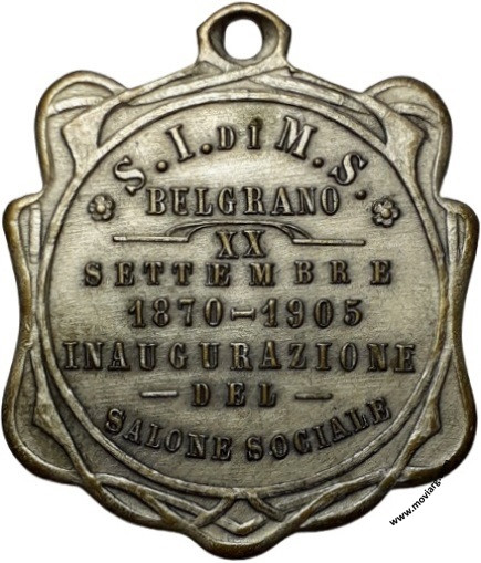 Anverso: Reverso: S. I. DI M. S. / BELGRANO / XX / SETTEMBRE / 1870 - 1905 / INAUGURAZIONE / DEL / SALONE SOCIALE Referencia: | |