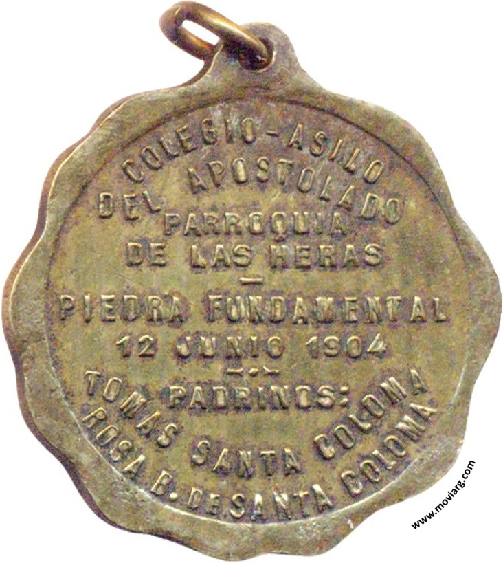 Anverso: Firma: CASANOVAS Y HORTA Reverso: COLEGIO - ASILO / DEL APOSTOLADO / PARROQUIA / DE LAS HERAS / PIEDRA FUNDAMENTAL / 12 JUNIO 1904 / PADRINOS: / TOMAS SANTA COLOMA / ROSA B. DE SANTA COLOMA Referencia: | |