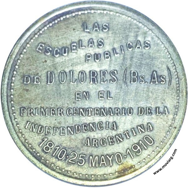 Colección Magnin Anverso: OID / MORTALES / EL GRITO / SAGRADO...Reverso: LAS / ESCUELAS / PUBLICAS / DE DOLORES ( BS. AS. ) / EN EL / PRIMER CENTENARIO DE LA / INDEPENDENCIA / ARGENTINA / 1810 · 25 MAYO · 1910 Referencia: | |