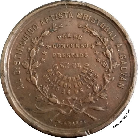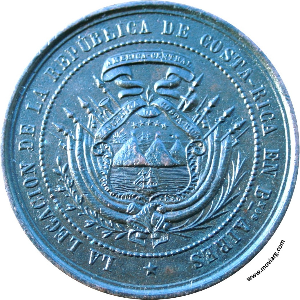Anverso: LA LEGACIÓN DE LA REPÚBLICA DE COSTA-RICA EN BNOS. AIRES. Campo: REPUBLICA / COSTA RICA / AMERICA-CENTRAL Reverso: AL DISTINGUIDO ARTISTA CRISTOBAL A. GALVAN / POR SU / CONCURSO / PRESTADO / EN EL / 1R. CENTENARIO / DE SIMON BOLIVAR / JULIO 24 DE 1883. Firma: R. GRANDE Referencia: | |