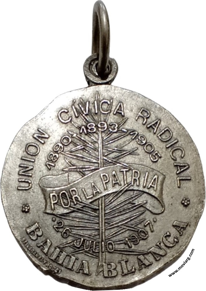 Anverso: Reverso: UNION CIVICA RADICAL / BAHIA BLANCA / 1890 - 1893 - 1905 / 26 JULIO 1907. Campo: POR LA PATRIA. Firma: BELLAGAMBA Y ROSSI Referencia: | |
