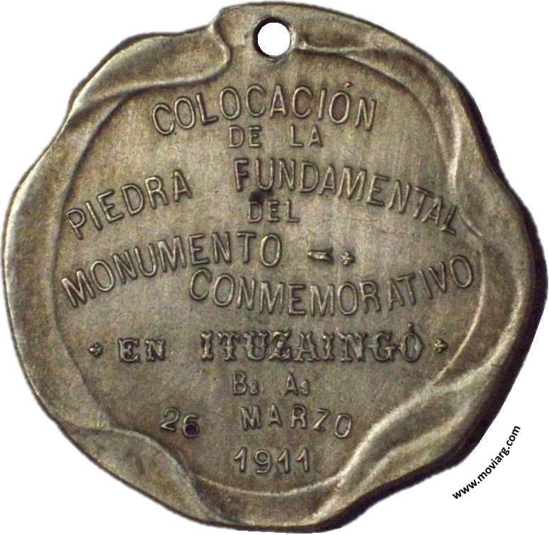 Anverso: VICTORIA DE ITUZAINGÓ / 20 DE FEBRERO 1827. Firma: C. Y AF. ROSSI Reverso: COLOCACIÓN / DE LA / PIEDRA FUNDAMENTAL / DEL / MONUMENTO / CONMEMORATIVO / EN ITUZAINGÓ / BS. AS. / 26 MARZO / 1911 Referencia: | |