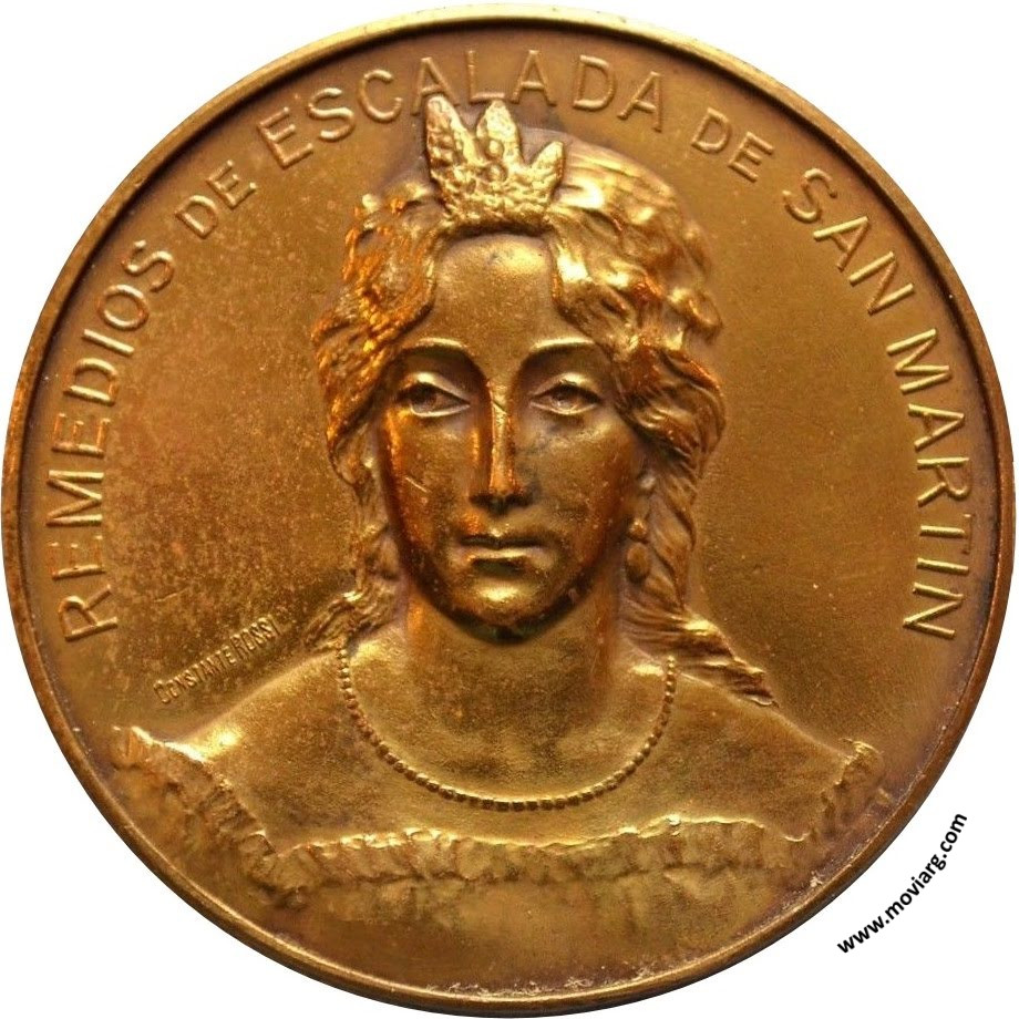 Anverso: REMEDIOS DE ESCALADA DE SAN MARTIN. Firma: CONSTANTE ROSSI Reverso: " YO ARMÉ / EL BRAZO DE ESE VALIENTE / QUE ASEGURÓ SU GLORIA / Y NUESTRA LIBERTAD " / LA COMISION DE HOMENAJE / EN EL PRIMER / CENTENARIO DE SU / FALLECIMIENTO / 3 AGOSTO / 1823 - 1923. Campo: DIOS Y PATRIA Canto: Liso. BRONCE Referencia: | |