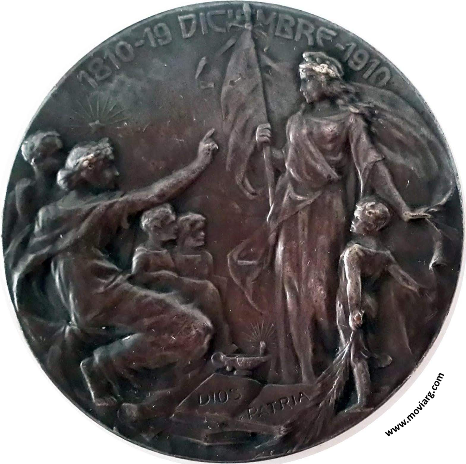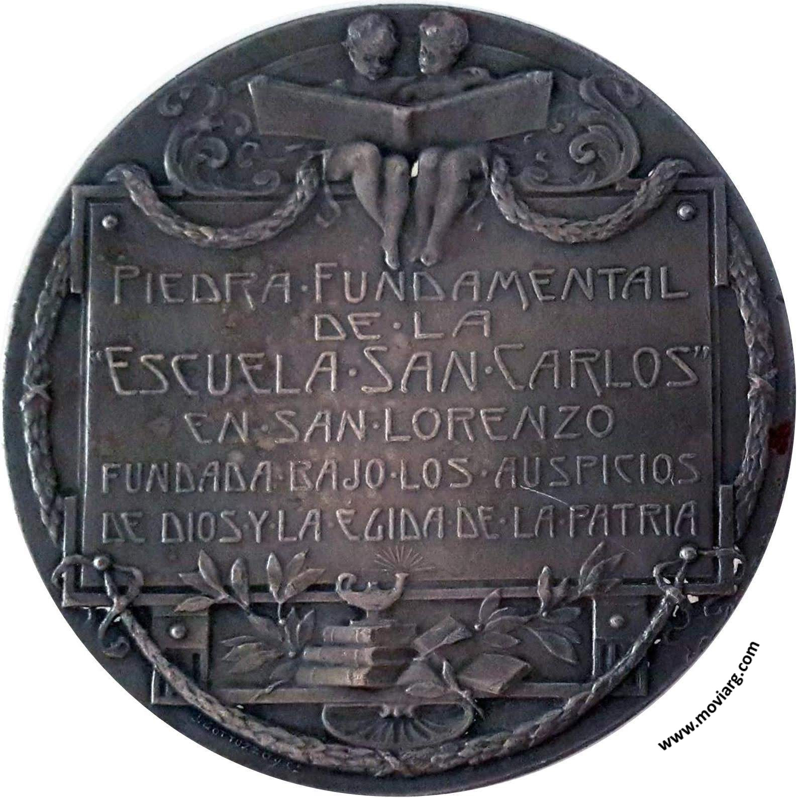 Anverso: 1810 - 19 DICIEMBRE - 1910. Campo: DIOS / PATRIA Reverso: PIEDRA FUNDAMENTAL / DE LA / " ESCUELA SAN CARLOS " / EN SAN LORENZO / FUNDADA BAJO LOS AUSPICIOS / DE DIOS Y LA EGIDA DE LA PATRIA. Firma: J. GOTTUZZO Y CA. Referencia: | |