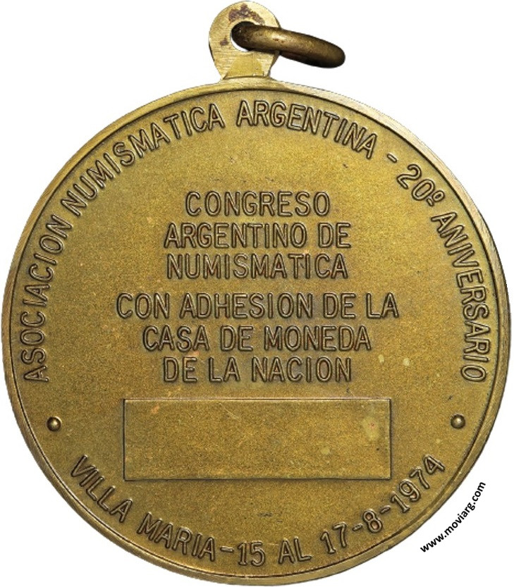 Anverso: ASOCIACIÓN NUMISMATICA ARGENTINA / BUENOS AIRES Reverso: ASOCIACION NUMISMATICA ARGENTINA - 20° ANIVERSARIO / VILLA MARIA - 15 AL 17 - 8 - 1974 / CONGRESO / ARGENTINO DE / NUMISMATICA / CON ADHESION DE LA / CASA DE MONEDA / DE LA NACION Referencia: | |