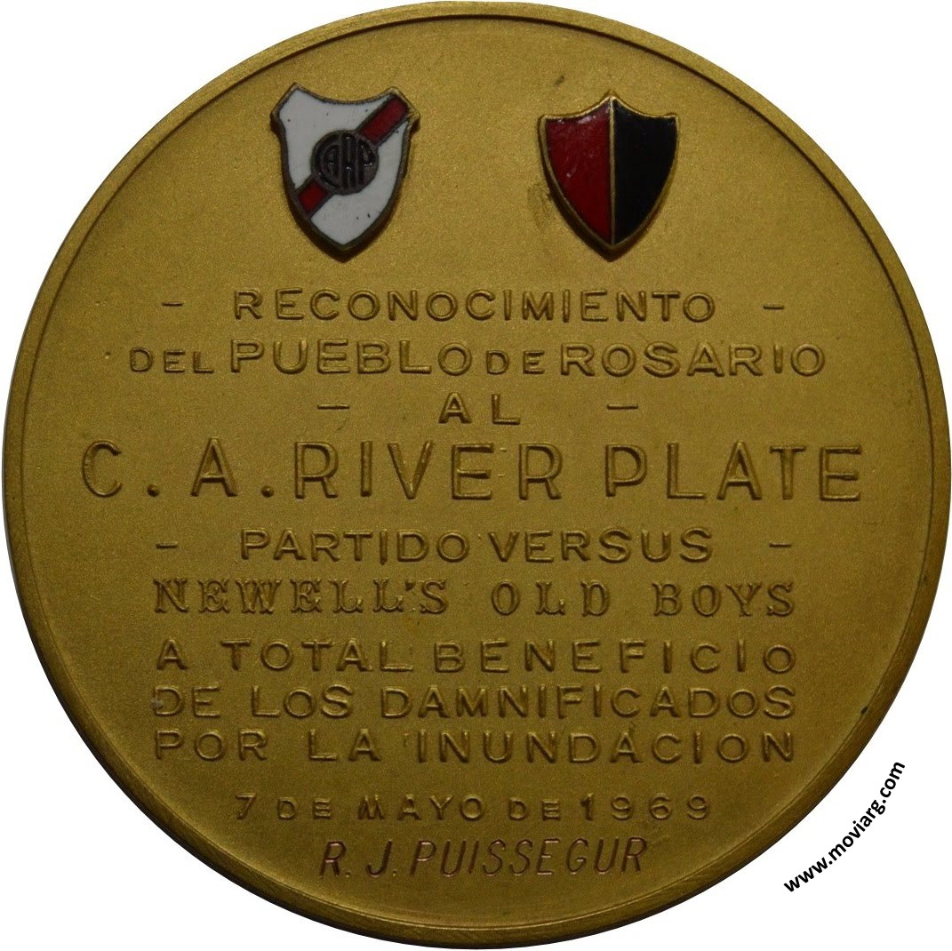 Anverso: MONUMENTO A LA BANDERA / ROSARIO. Firma: TALLS. O. GALLO Reverso: RECONOCIMIENTO / DEL PUEBLO DE ROSARIO / AL / C. A. RIVER PLATE / PARTIDO VERSUS / NEWELL'S OLD BOYS / A TOTAL BENEFICIO / DE LOS DAMNIFICADOS / POR LA INUNDACION / 7 DE MAYO 1969 / [ R. J. PUISSEGUR ] Referencia: | |