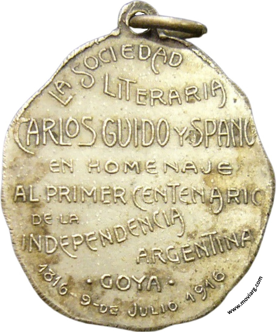 Anverso: Firma: GOTTUZZO Y CA. Reverso: LA SOCIEDAD / LITERARIA / CARLOS GUIDO Y SPANO / EN EL HOMENAJE / AL PRIMER CENTENARIO / DE LA / INDEPENDENCIA / ARGENTINA / GOYA / 1816 - 9 - DE JULIO 1916 Referencia: | |