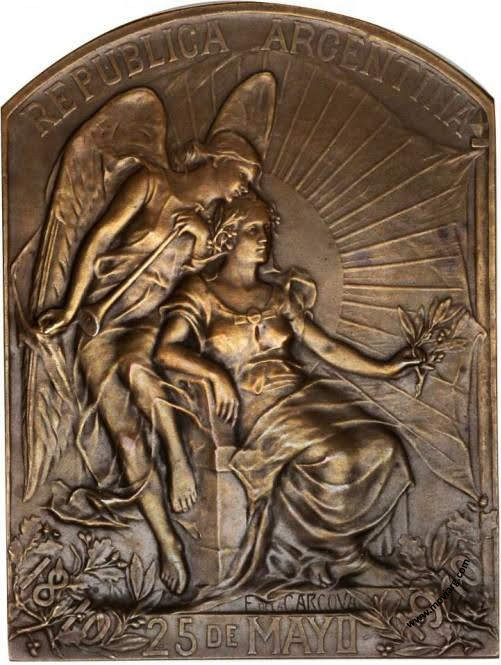 Anverso: REPUBLICA ARGENTINA / 1810 25 DE MAYO 1910. Firma: E. DE LA CARCOVA Reverso: EXPOSICION / INTERNACIONAL / DE / ARTE / BUENOS - AIRES. Firma: E DE LA CARCOVA Referencia: BURZIO-1213 | |