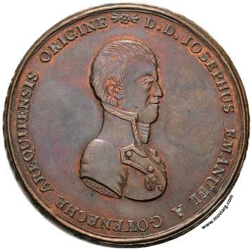 Anverso: D.D. JOSEPHUS EMANUEL A GOYENECHE AREQUIPENSIS ORIGINE. Firma: MONCAYO Reverso: MUNICIPIUM POTOSI IN GRATULATIONEM ASSERTORIS LIBERTATIS PATRIÆ A 1811 / MILITUM / ÆGREGIUS MAGIS / TER SUB FERD. VII / AUGUSTO CONFREGIT / ARGENTINA CASTRA IN / CONFLICTU CAMPESTRI Ð / HUAQUI ET SYPESYPE, ATQUE / SUBEGIT COMITER CIVITA: / TES SUBERSAS POTOSI, PAZ, / COCHABAMBA ET CHUQUISA / CA, IN PERPETUM CONCILI / ATIONIS MONUMENTUM / POPULORUM, IURIUM, / ET REGIS Canto: Laureado Referencia: | |