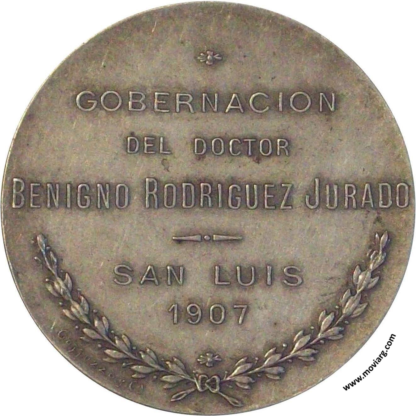 Anverso: ESCUELA / LAFINUR / NON SCHOLOE SED VITOE DISCIMUS Reverso: GOBERNACION / DEL DOCTOR / BENIGNO RODRIGUEZ JURADO / SAN LUIS / 1907. Firma: GOTTUZZO Y CA. Canto: Liso. PLATA Referencia: | |