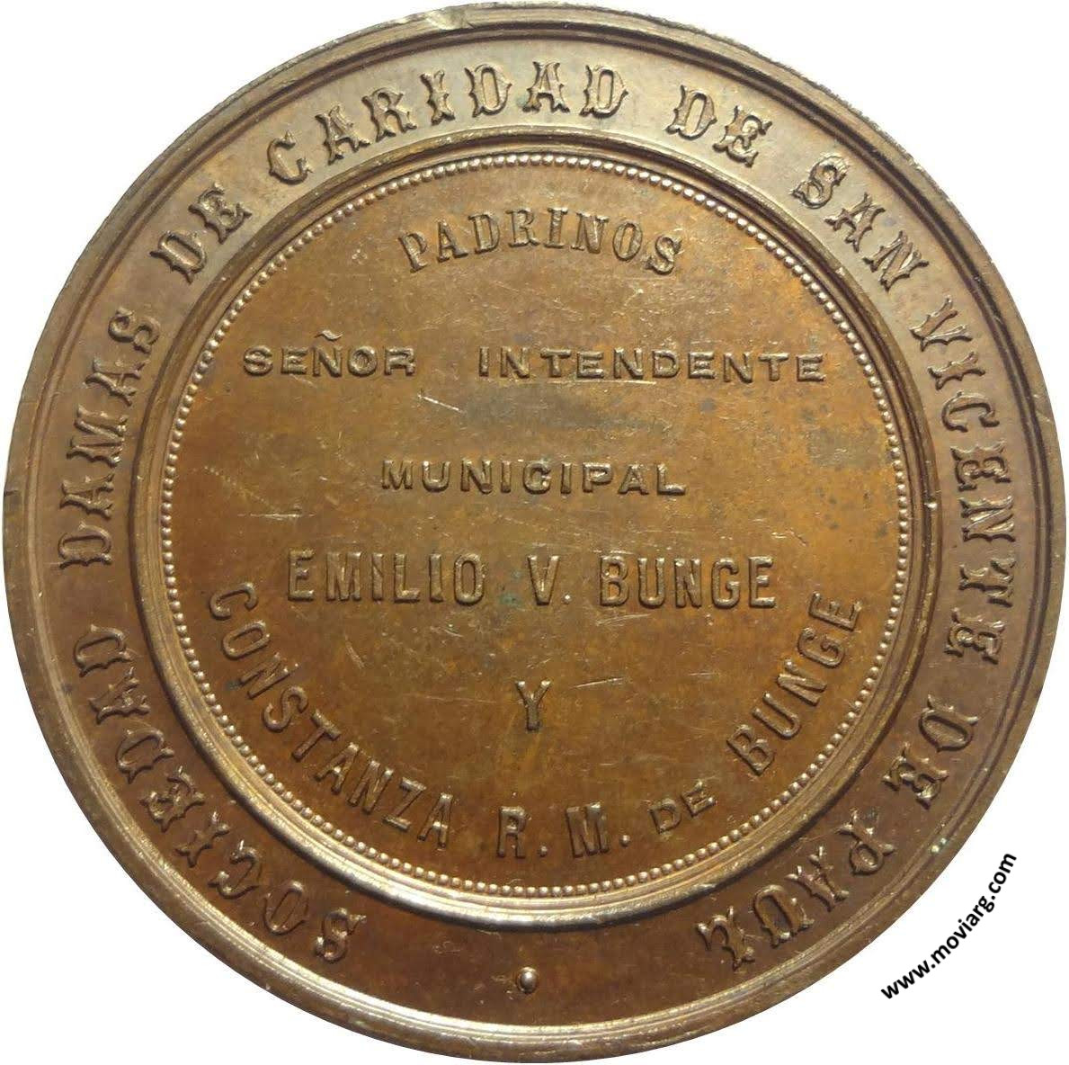 Anverso: INAUGURACION DEL 4° ASILO MATERNAL / 7 DE JUNIO 1896 / BUENOS-AIRES. Firma: ORZALI. B. Y C. Reverso: SOCIEDAD DAMAS DE CARIDAD DE SAN VICENTE DE PAUL / PADRINOS / SEÑOR INTENDENTE / MUNICIPAL / EMILIO V. BUNGE / Y / CONSTANZA R. M. DE BUNGE Canto: Humberto Burzio: "Buenos Aires en la medalla" 1981 p1013. Referencia: BURZIO-3195 ROSA-/166 | |