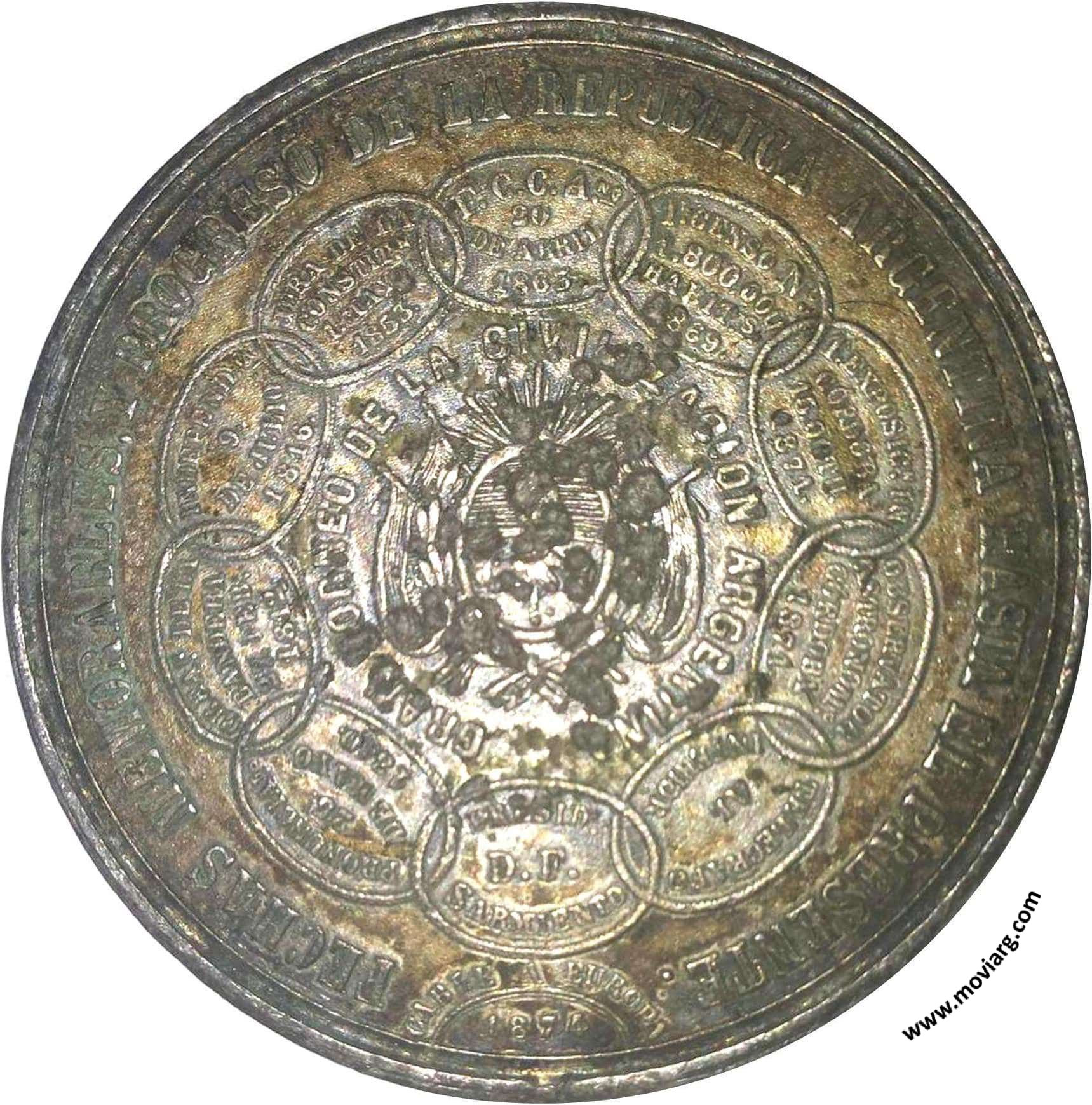 Anverso: COMISION DIRECTIVA DE LA EXPOSICION NACIONAL / CÓRDOBA. Firma: S. CACCIA / ROSARIO DE SANTA - FÉ Reverso: FECHAS MEMORABLES, Y PROGRESO DE LA REPUBLICA ARGENTINA HASTA EL PRESENTE / GRAN TORNEO DE LA CIVILIZACION ARGENTINA. Campo: PRONUNCIATO. / 25 / DE MAYO / 1810. / CREACIO. DE LA / BANDERA / 27 FEB. / 1812. / INDEPENDC. / 9 / DE JULIO / 1816. / JURA DE LA / CONSTITN. / 1 MAYO / 1853. / F.C.C.A.NO. / 20 / DE ABRIL / 1863. / 1R. CENSO NO. / 1,800,000 / HABITS. / 1869. / 1. EXPOSICN. / CÓRDOBA / 15 OCTU. / 1871. / TELEGRAFO / AL / INTERIOR / PRESIDENTE / D.F. / SARMIENTO. Exergo: CABLE A EUROPA / 1874. Referencia: ROSA-1509/181 FERRARI-27 (SC) | |