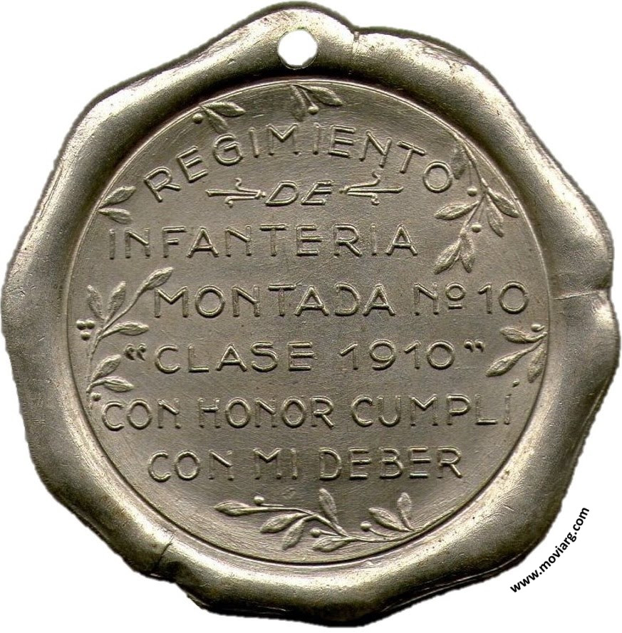 Anverso: Firma: JOSE F. PIANA Reverso: REGIMIENTO / DE / INFANTERIA / MONTADA N°10 / " CLASE 1910 " / CON HONOR CUMPLÍ / CON MI DEBER Referencia: | |
