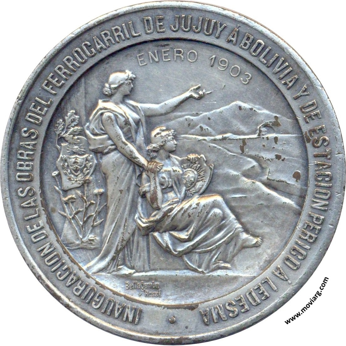 Anverso: INAUGURACION DE LAS OBRAS DEL FERROCARRIL DE JUJUY Á BOLIVIA Y DE ESTACION PERICO Á LEDESMA / ENERO 1903. Firma: BELLAGAMBA / Y ROSSI Reverso: FERROCARRIL / DE / JUJUY Á BOLIVIA / Y DE / ESTACION PERICO / Á / LEDESMA Referencia: | |