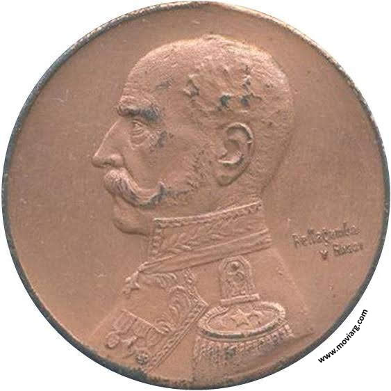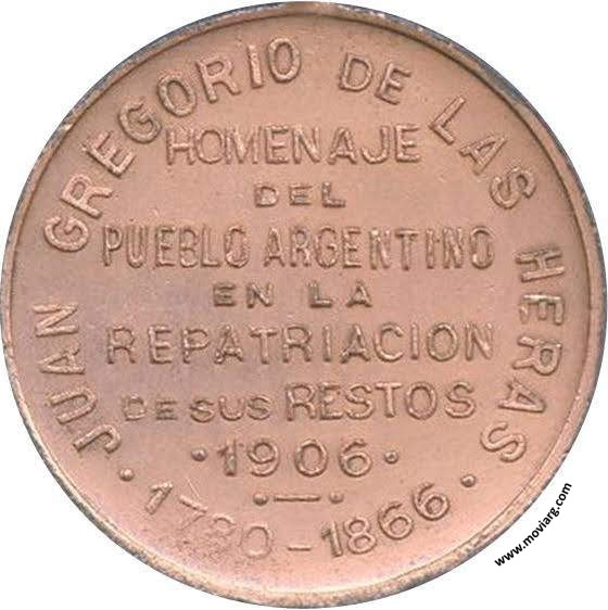 Anverso: Firma: BELLAGAMBA / Y ROSSI Reverso: JUAN GREGORIO DE LAS HERAS / 1780 - 1866 / HOMENAJE / DEL / PUEBLO ARGENTINO / EN LA / REPATRIACION / DE SUS RESTOS / 1906 Referencia: BURZIO-1526 | |