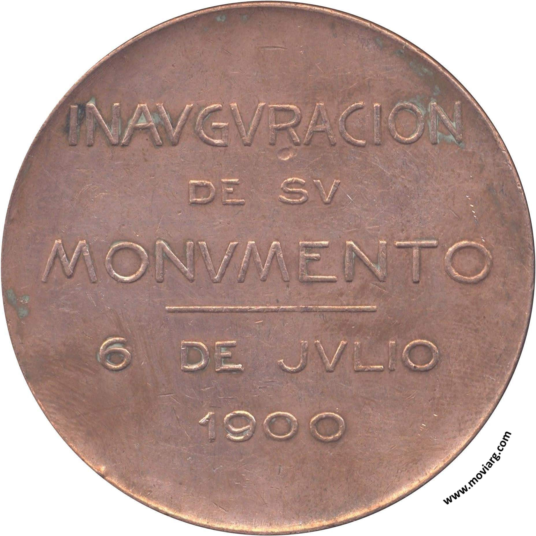 Anverso: IGNACIO PIROVANO / 1844 / 1895. Firma: BELLAGAMBA Y ROSSI Reverso: INAUGURACION / DE SU / MONUMENTO / 6 DE JULIO / 1900 Referencia: BURZIO-501 | |