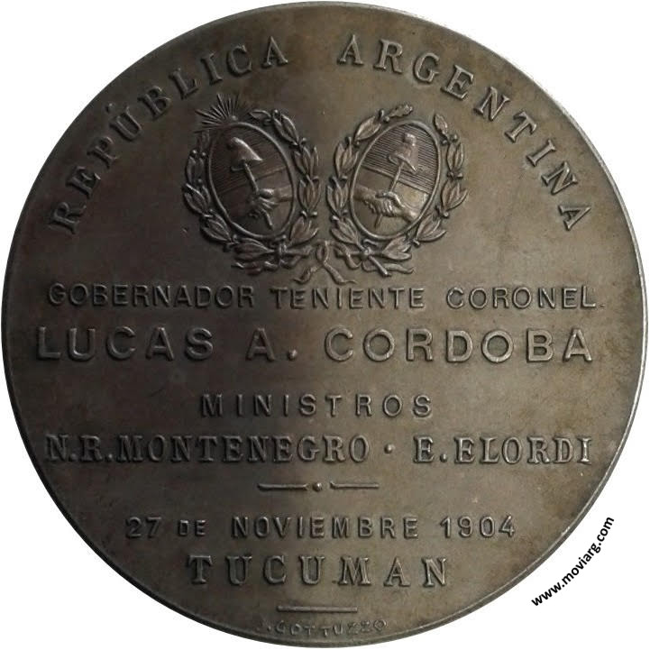 Anverso: INAUGURACION DE LAS OBRAS DEL DIQUE / "EL CADILLAL" Reverso: REPÚBLICA ARGENTINA / GOBERNADOR TENIENTE CORONEL / LUCAS A. CORDOBA / MINISTROS / N.R. MONTENEGRO · E. ELORDI / 27 DE NOVIEMBRE 1904 / TUCUMAN. Firma: J. GOTTUZZO Referencia: | |