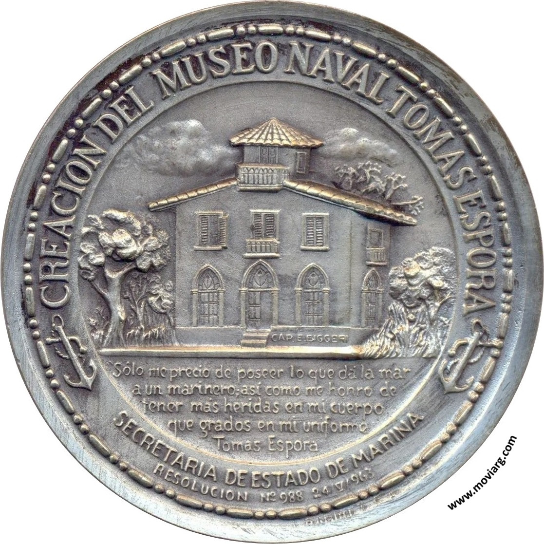 Anverso: CORONEL DE MARINA TOMAS ESPORA / 1800 - 1835 / CONSIDERO LA ESPADA DE ESTE OFICIAL UNA DE LAS PRIMERA DE AMÉRICA... ATTE. GUILLERMO BROWN. Firma: E. BUCCI Reverso: CREACION DEL MUSEO NAVAL TOMAS ESPORA / SECRETARIA DE ESTADO DE MARINA / RESOLUCION N° 988 24 / V / 963 / " SÓLO ME PRECIO DE POSEER LO QUE DÁ LA MAR / A UN MARINERO; ASÍ COMO ME HONRO DE / TENER MÁS HERIDAS EN MI CUERPO / QUE GRADOS EN MI UNIFORME " / TOMAS ESPORA. Firma: CAP. E. BIGGERI Referencia: | |