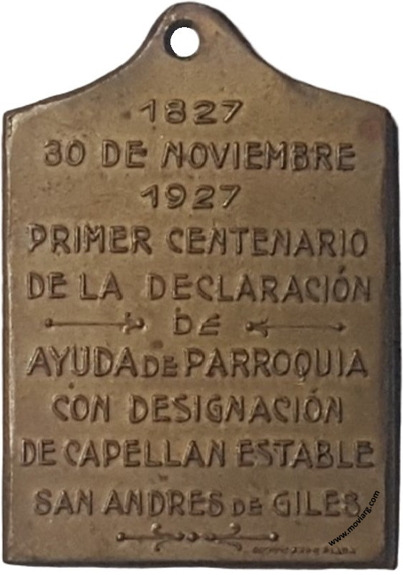 Anverso: Reverso: 1827 / 30 DE NOVIEMBRE / 1927 / PRIMER CENTENARIO / DE LA DECLARACIÓN / DE / AYUDA DE PARROQUIA / CON DESIGNACIÓN / DE CAPELLAN ESTABLE / SAN ANDRES DE GILES. Firma: GOTTUZZO Y PIANA Referencia: | |
