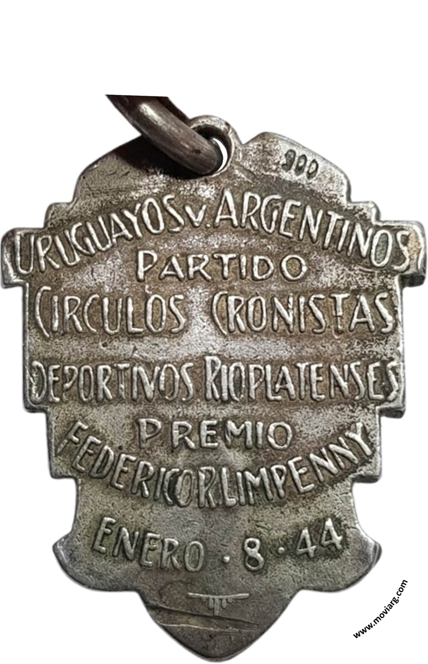 Anverso: [ R. I. LOPEZ ]. Campo: C.C.D. Reverso: URUGUAYOS V. ARGENTINOS / PARTIDO / CIRCULOS CRONISTAS / DEPORTIVOS RIOPLATENSES / PREMIO / FEDERICO R. LIMPENNY / ENERO · 8 · 44. Exergo: [ 900 ] Referencia: | |