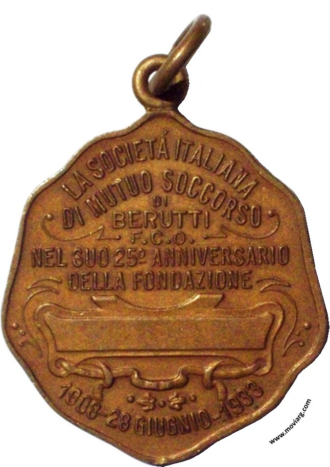 Anverso: Firma: CONSTANTE ROSSI Reverso: LA SOCIETÁ ITALIANA / DI MUTUO SOCCORSO / DI / BERUTTI / F.C.O. / NEL SUO 25° ANNIVERSARIO / DELLA FONDAZIONE / 1908 - 28 GIUGNIO - 1933 Referencia: | |