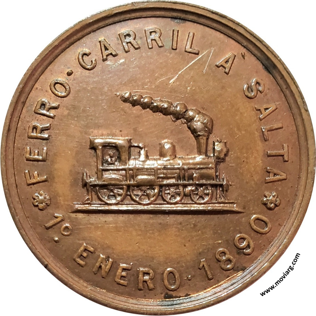 Anverso: FERRO-CARRIL A SALTA / 1° ENERO 1890 Reverso: EL PUEBLO DE SALTA / A LOS TRABAJADORES DEL FERRO-CARRIL Referencia: ROSA-356a/123 | |