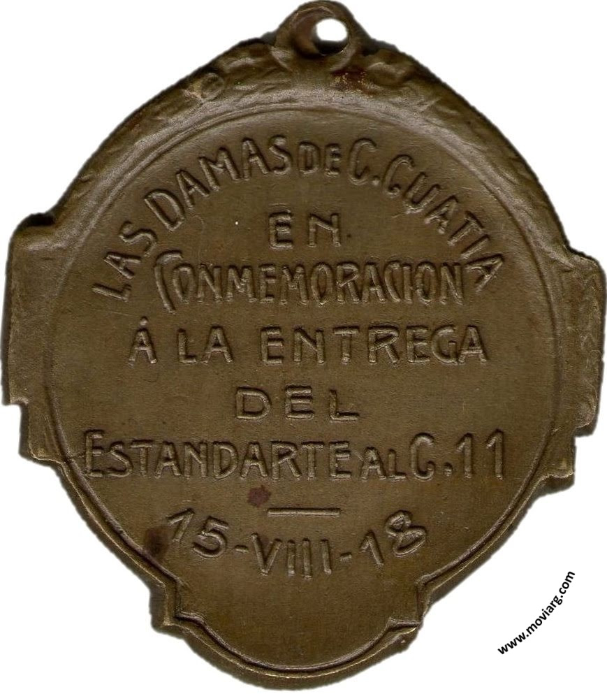 Anverso: EJERCITO ARGENTINO / C / 11. Firma: GOTTUZZO Y PIANA Reverso: LAS DAMAS DE C. CUATIA / EN / CONMEMORACION / Á LA ENTREGA / DEL / ESTANDARTE AL C. 11 / 15 - VIII - 18 Referencia: | |