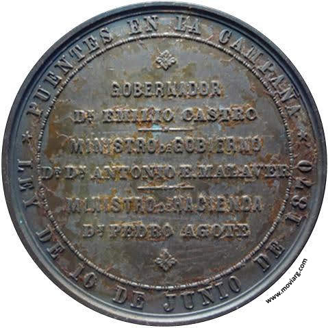 Anverso: REPUBLICA ARGENTINA / PROVINCIA DE BUENOS AYRES. Firma: J.S. & A.B. WYON SC. Reverso: PUENTES EN LA CAMPAÑA / LEY DE 10 DE JUNIO DE 1870 / GOBERNADOR / DN. EMILIO CASTRO / MINISTRO DE GOBIERNO / DR. DN. ANTONIO E. MALAVER / MINISTRO DE HACIENDA / DN. PEDRO AGOTE Referencia: ROSA-294/67 PRADO-1944 | |