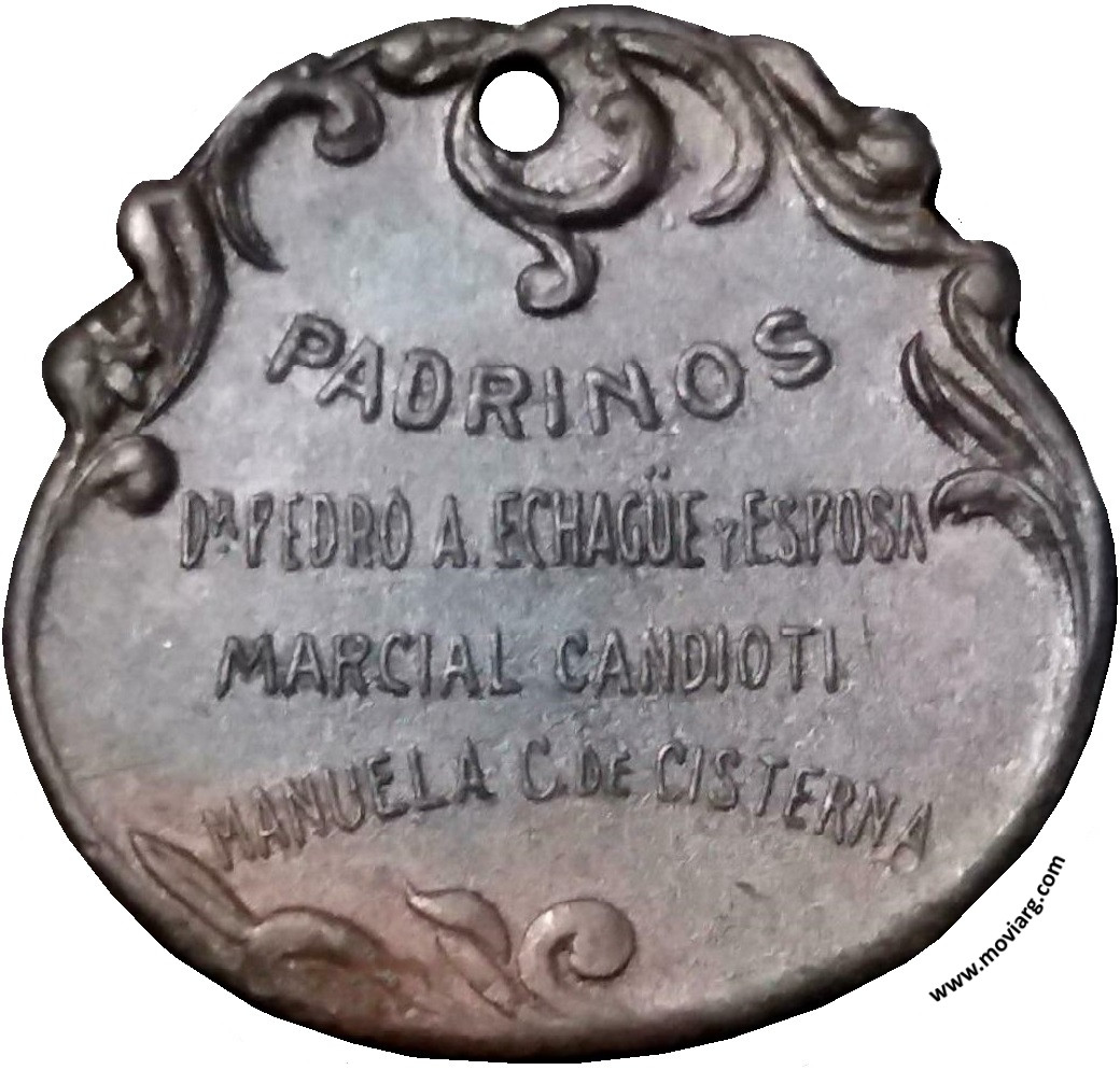 Anverso: CAPILLA DE N. S. DEL ROSARIO / CANDIOTI / OCTUBRE / 1906. Firma: HORTA Y CIA. Reverso: PADRINOS / DR. PEDRO A. ECHAGÜE Y ESPOSA / MARCIAL CANDIOTI / MANUELA C. DE CISTERNA Referencia: | |