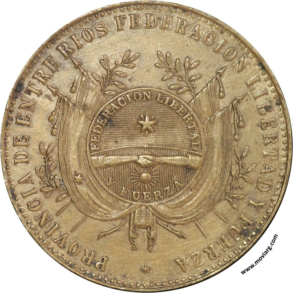 Anverso: PROVINCIA DE ENTRE RIOS FEDERACION LIBERTAD Y FUERZA / FEDERACION LIBERTAD / Y FUERZA Reverso: DEFENSOR ILUSTRE DE LOS PUEBLOS ENTRERIANOS. Firma: RABONE BROS. & CO. Referencia: | |