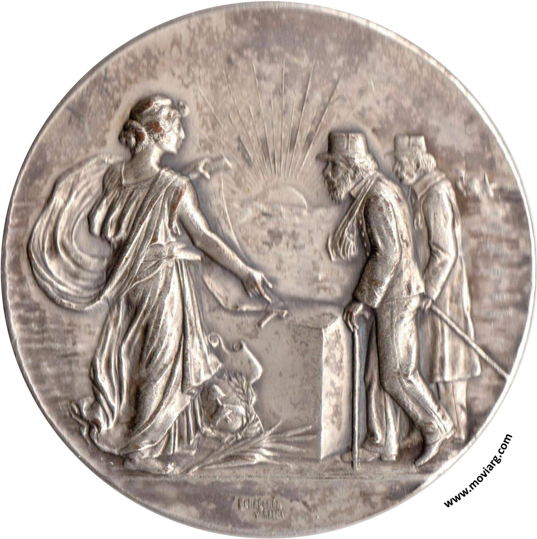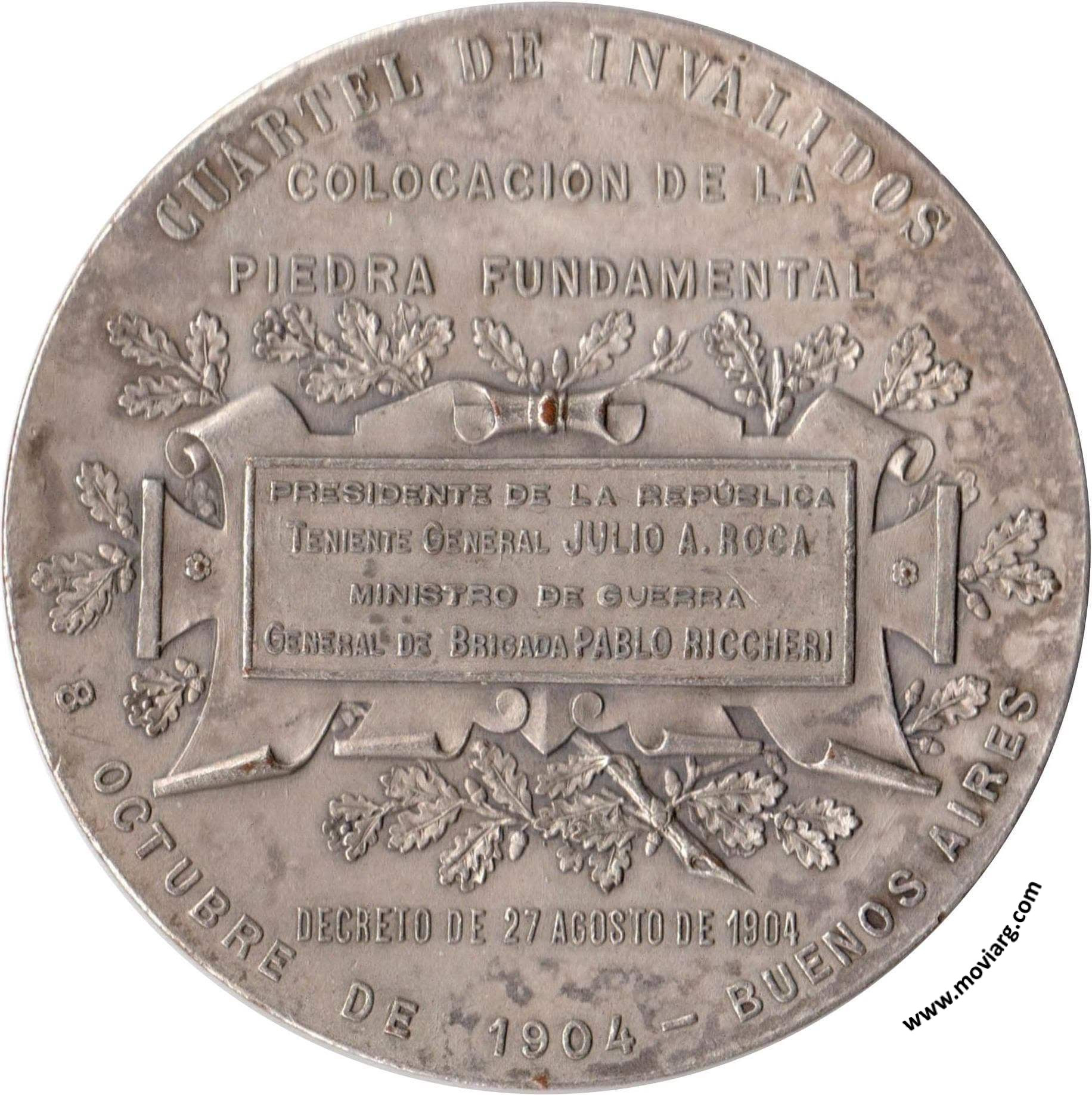 Anverso: Firma: BELLAGAMBA / Y ROSSI Reverso: CUARTEL DE INVÁLIDOS / COLOCACION DE LA / PIEDRA FUNDAMENTAL / DECRETO DE 27 AGOSTO DE 1904 / 8 OCTUBRE DE 1904 - BUENOS AIRES / PRESIDENTE DE LA REPÚBLICA / TENIENTE GENERAL JULIO A. ROCA / MINISTRO DE GUERRA / GENERAL DE BRIGADA PABLO RICCHERI Referencia: BURZIO-415 | |