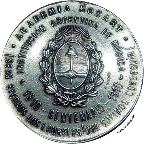 Anverso: ACADEMIA MOZART / SEAN ETERNOS LOS LAURELES QUE SUPIMOS CONSEGUIR / INSTITUCIÓN ARGENTINA DE MÚSICA / 1810 - CENTENARIO - 1910. Firma: C. Y AF. ROSSI Reverso: LA PRIMERA AUDICIÓN DEL HIMNO. Firma: CV Referencia: | |