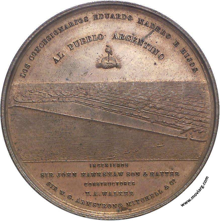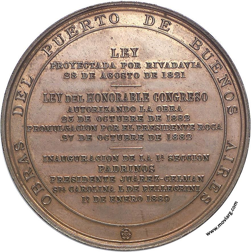 Anverso: LOS CONCESIONARIOS EDUARDO MADERO E HIJOS / AL PUEBLO ARGENTINO / INGENIEROS / SIR JOHN HAWKSHAW SON & HAYTER / CONSTRUCTORES / T. A. WALKER / SIR W. G. ARMSTRONG MITCHELL & CO. Reverso: OBRAS DEL PUERTO DE BUENOS AIRES / LEY / PROYECTADA POR RIVADAVIA / 28 DE AGOSTO DE 1821 / LEY DEL HONORABLE CONGRESO / AUTORIZANDO LA OBRA / 25 DE OCTUBRE DE 1882 / PROMULGACION POR EL PRESIDENTE ROCA / 27 DE OCTUBRE DE 1882 / INAUGURACION DE LA 1A. SECCION / PADRINOS / PRESIDENTE JUAREZ-CELMAN / SRA. CAROLINA I. DE PELLEGRINI / 1° DE ENERO DE 1889 Canto: Humberto Burzio: "Buenos Aires en la medalla" 1981 p254. Referencia: BURZIO-724 ROSA-/117 | |
