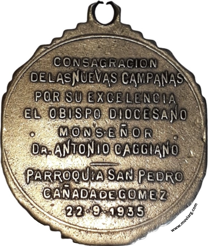 Anverso: Reverso: CONSAGRACION / DE LAS NUEVAS CAMPANAS / POR SU EXCELENCIA / EL OBISPO DIOCESANO / MONSEÑOR / DR. ANTONIO CAGGIANO / PARROQUIA SAN PEDRO / CAÑADA DE GOMEZ / 22 · 9 · 1935 Referencia: | |