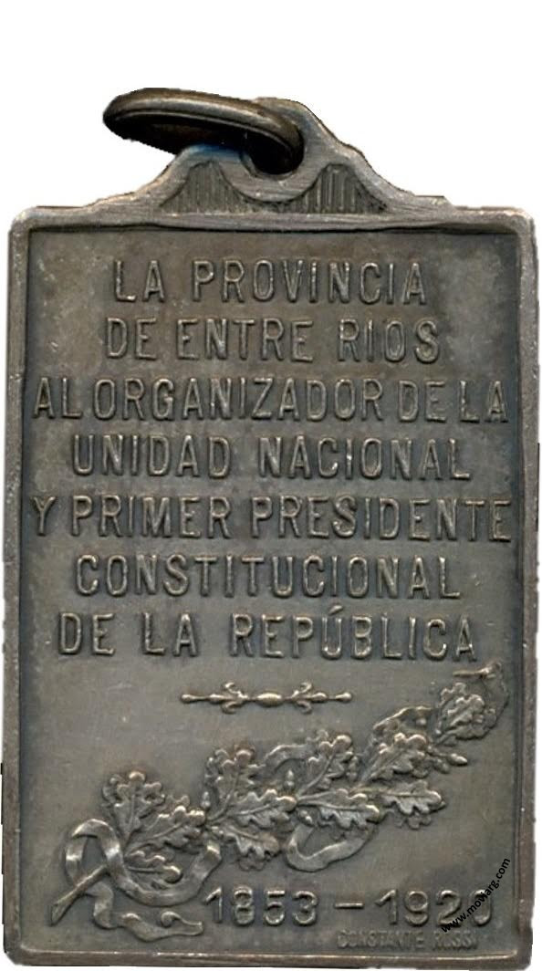 Anverso: GL. JUSTO JOSÉ DE URQUIZA / INAUGURACIÓN / DE SU MONUMENTO / 11 DE NOVIEMBRE 1920 Reverso: LA PROVINCIA / DE ENTRE RIOS / AL ORGANIZADOR DE LA / UNIDAD NACIONAL / Y PRIMER PRESIDENTE / CONSTITUCIONAL / DE LA REPÚBLICA / 1853 - 1920. Firma: CONSTANTE ROSSI Referencia: | |